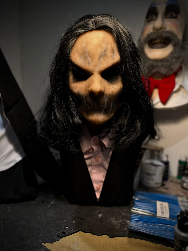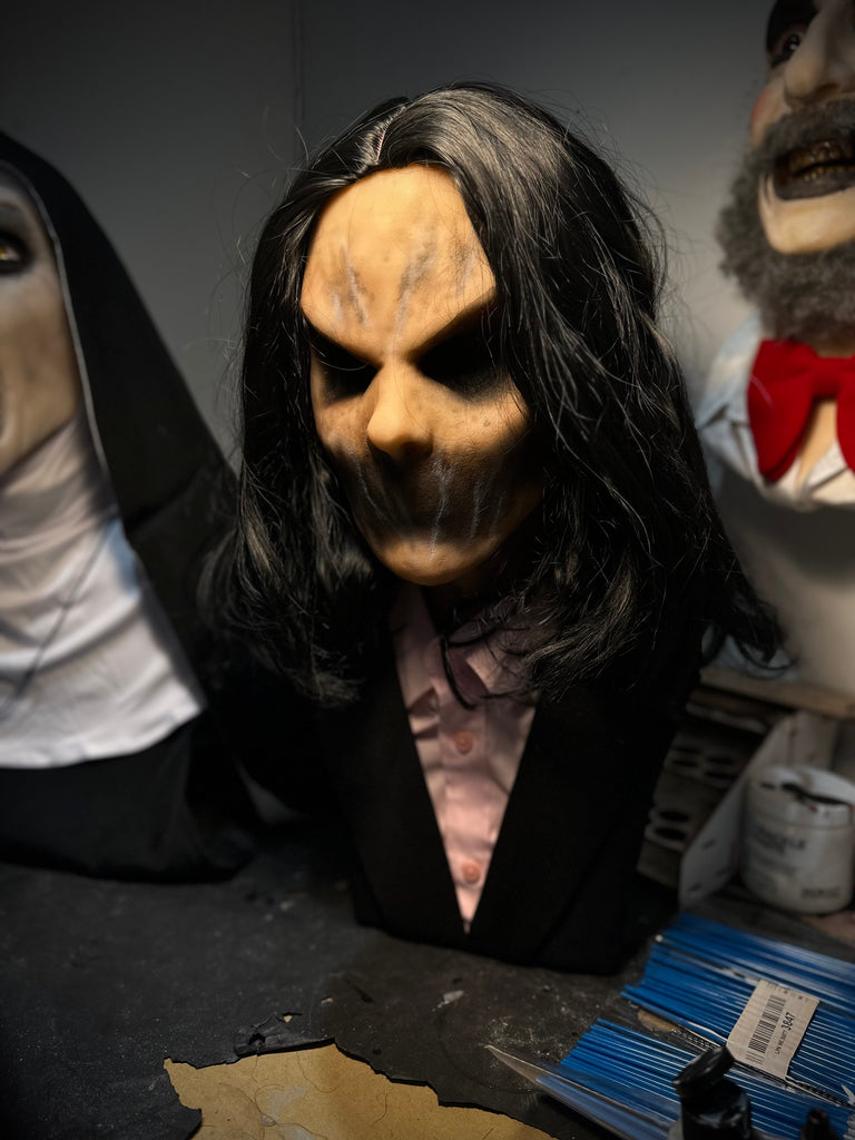 The back of the bust has been painted to represent the film cover, with the letters running on the dirty white/cream walls with the blood smeared across